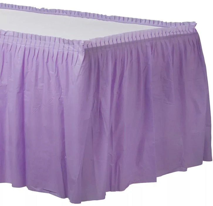 Deck out your table with a Lavender Plastic Table Skirt! This lavender table skirt is a quick and easy way to add some colorful, festive flair to your party. An adhesive backing allows you to adhere this plastic table skirt to most tables. Use it at your lavender-themed party it's also a clever way to hide extra party supplies you might be storing under your buffet tables!